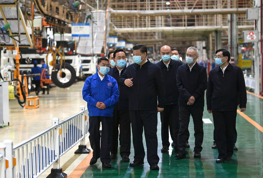 ↑2020年4月22日,習近平在陜西汽車控股集團有限公司總裝車間察看生產(chǎn)線,了解產(chǎn)品研發(fā)、生產(chǎn)、銷售和復工復產(chǎn)情況。